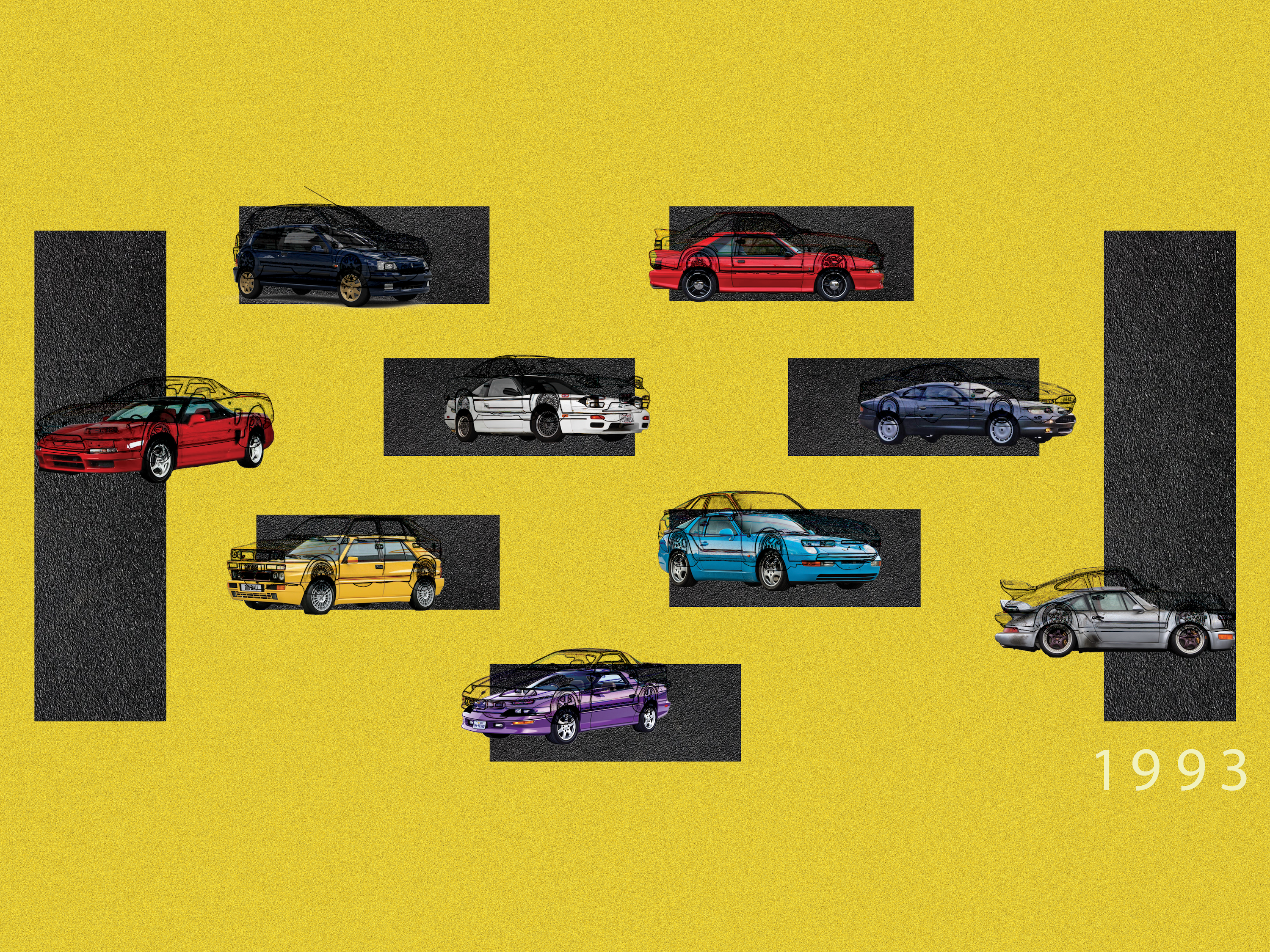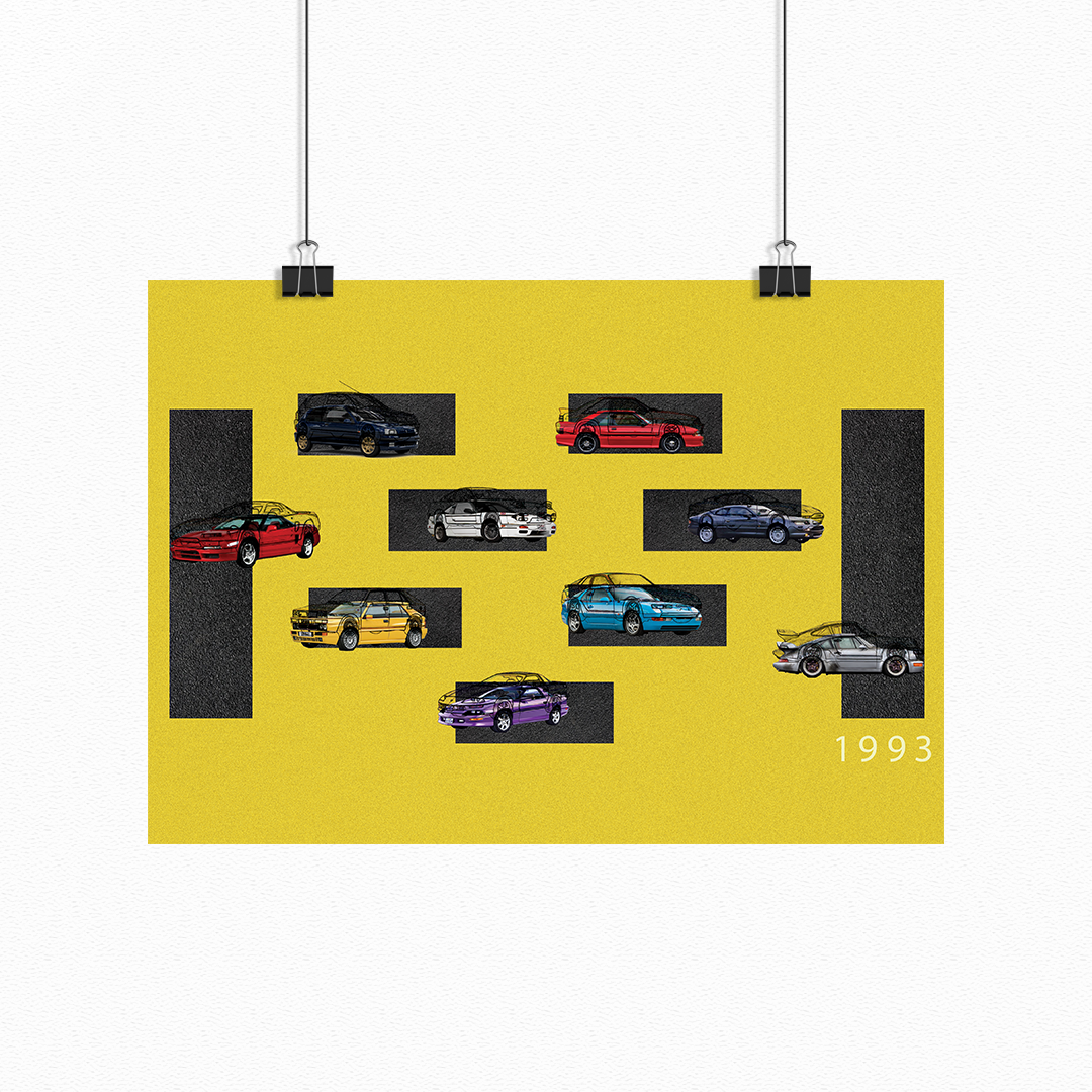 This pop-bright canvas nods to a golden era of tuning culture—where speed met self-expression on city grids and car meets. Equal parts nostalgia and graphic precision.