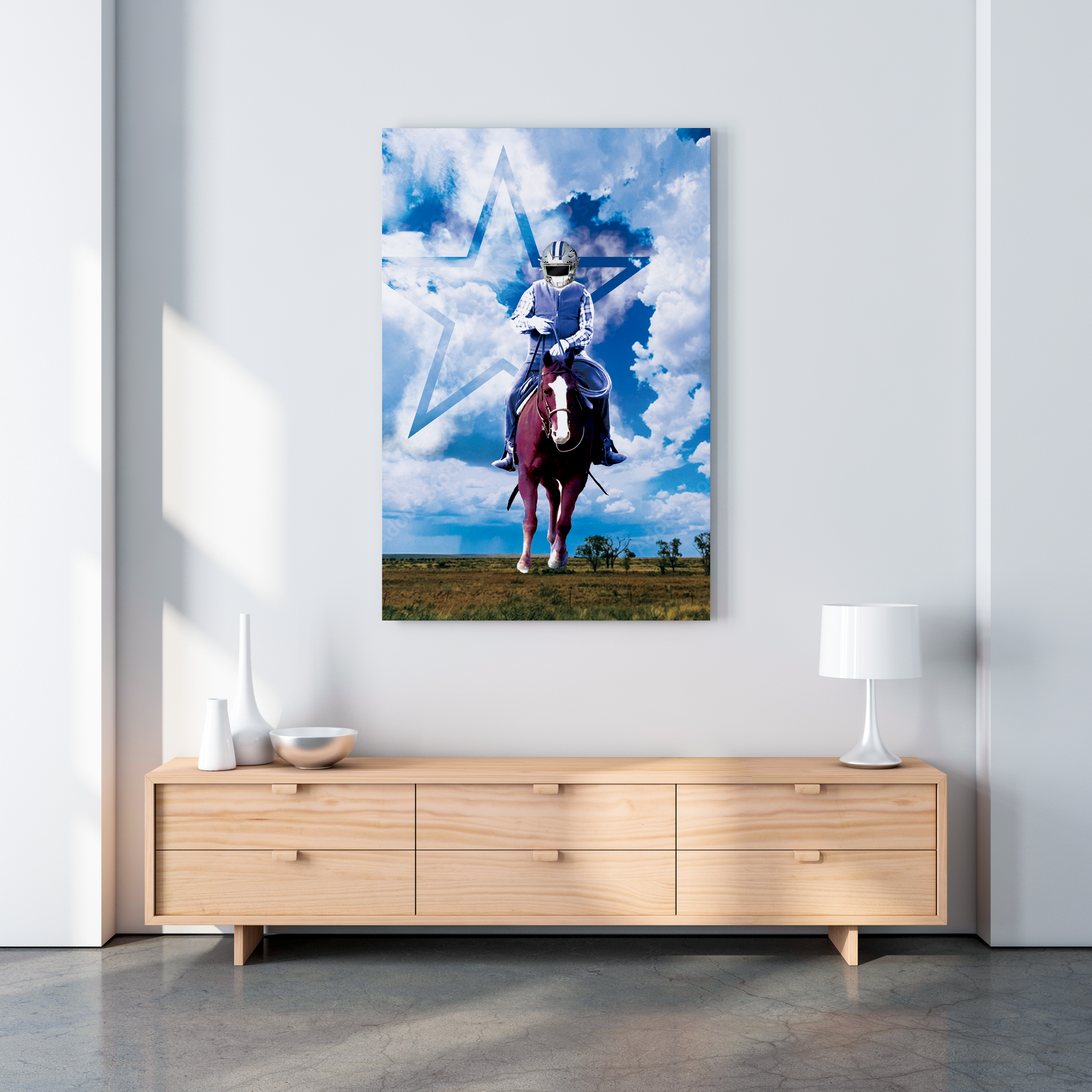 Cowboys Fan Favorite fuses the spirit of the rodeo with the rush of the stadium—an unforgettable surrealist mash-up that turns tradition into spectacle. Bold, witty, and unapologetically larger than life.