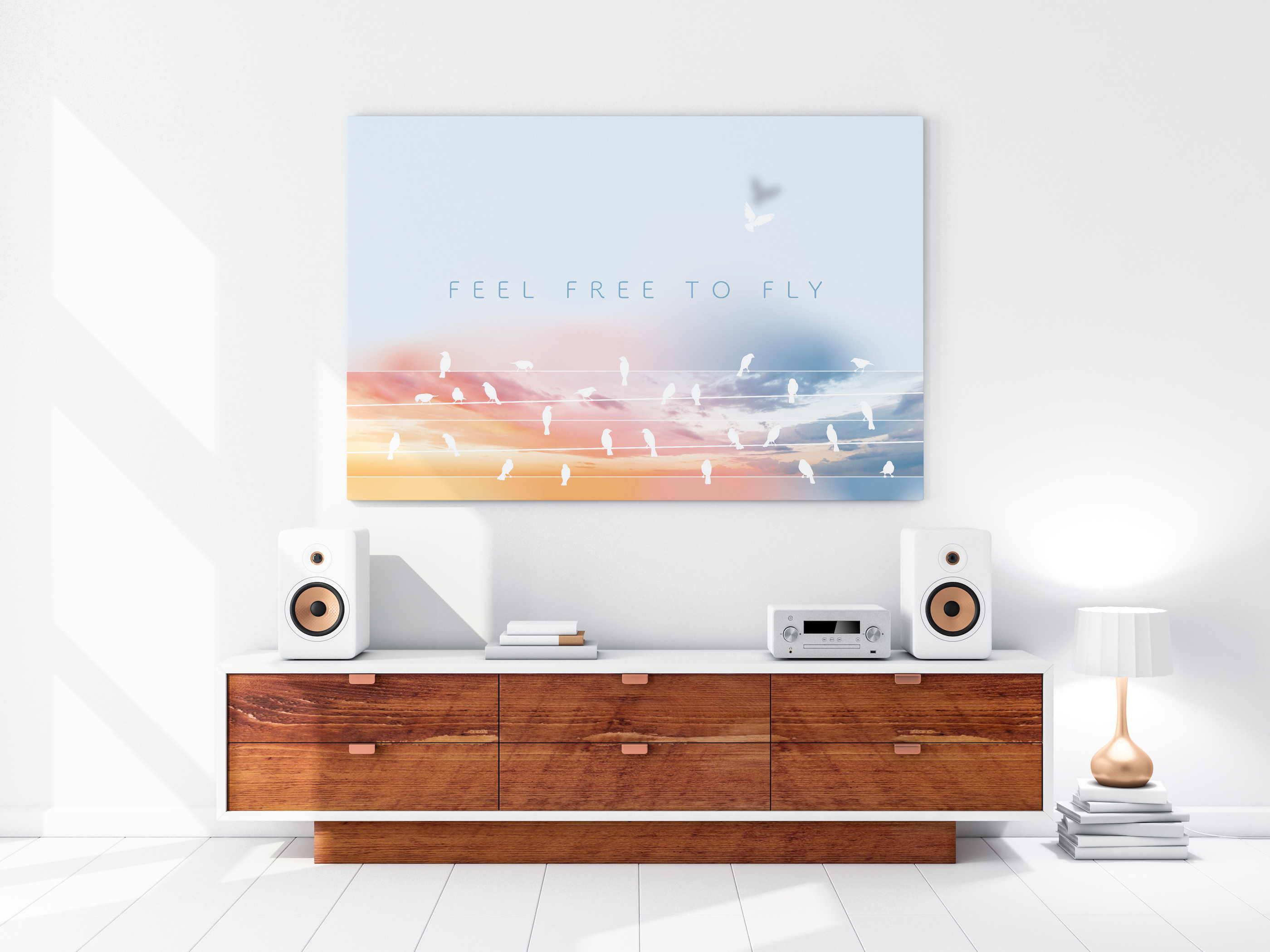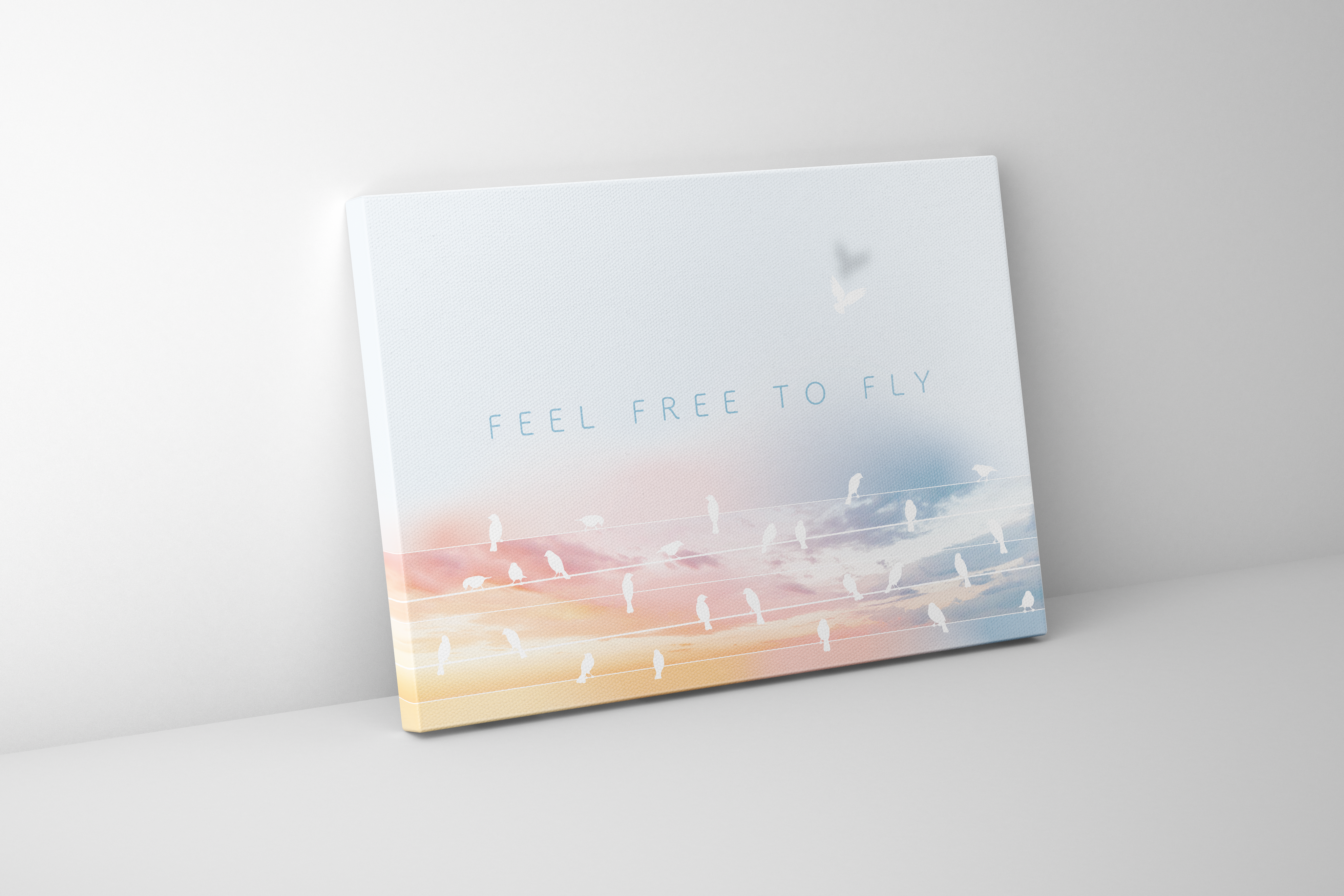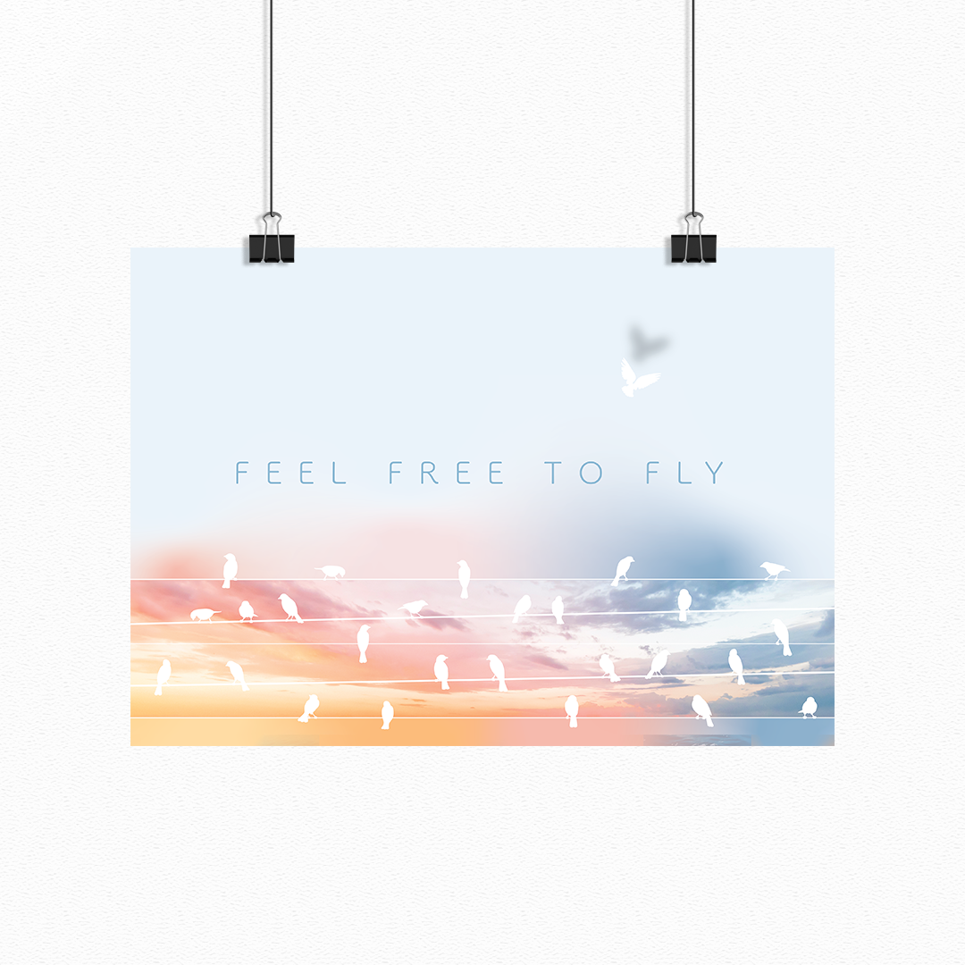 Grace meets freedom. Feel Free to Fly captures the moment when dreams take flight, with birds ascending into a serene, feminine sky. A soft yet powerful reminder that the sky’s never the limit.