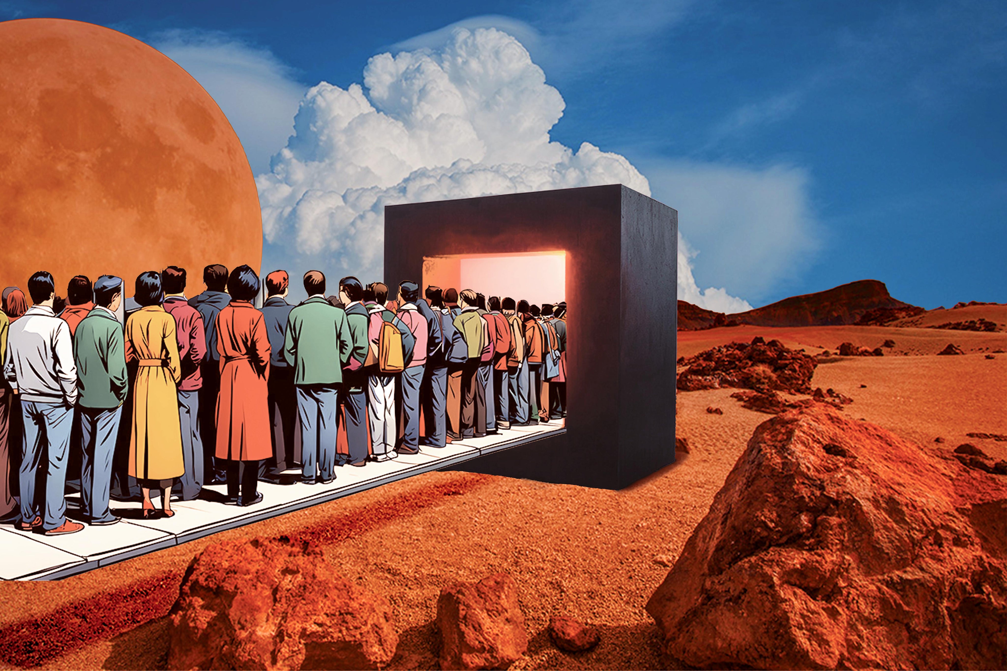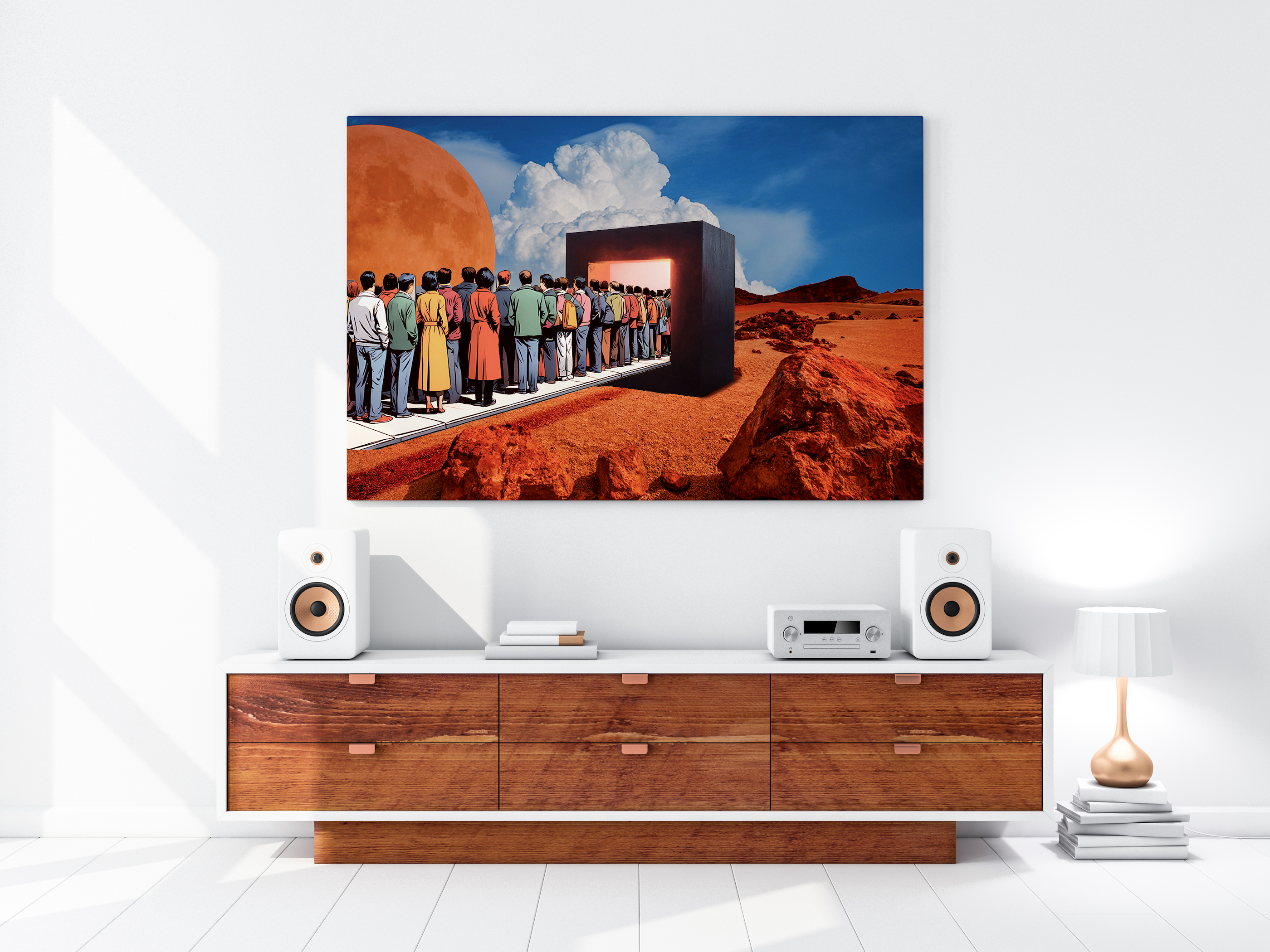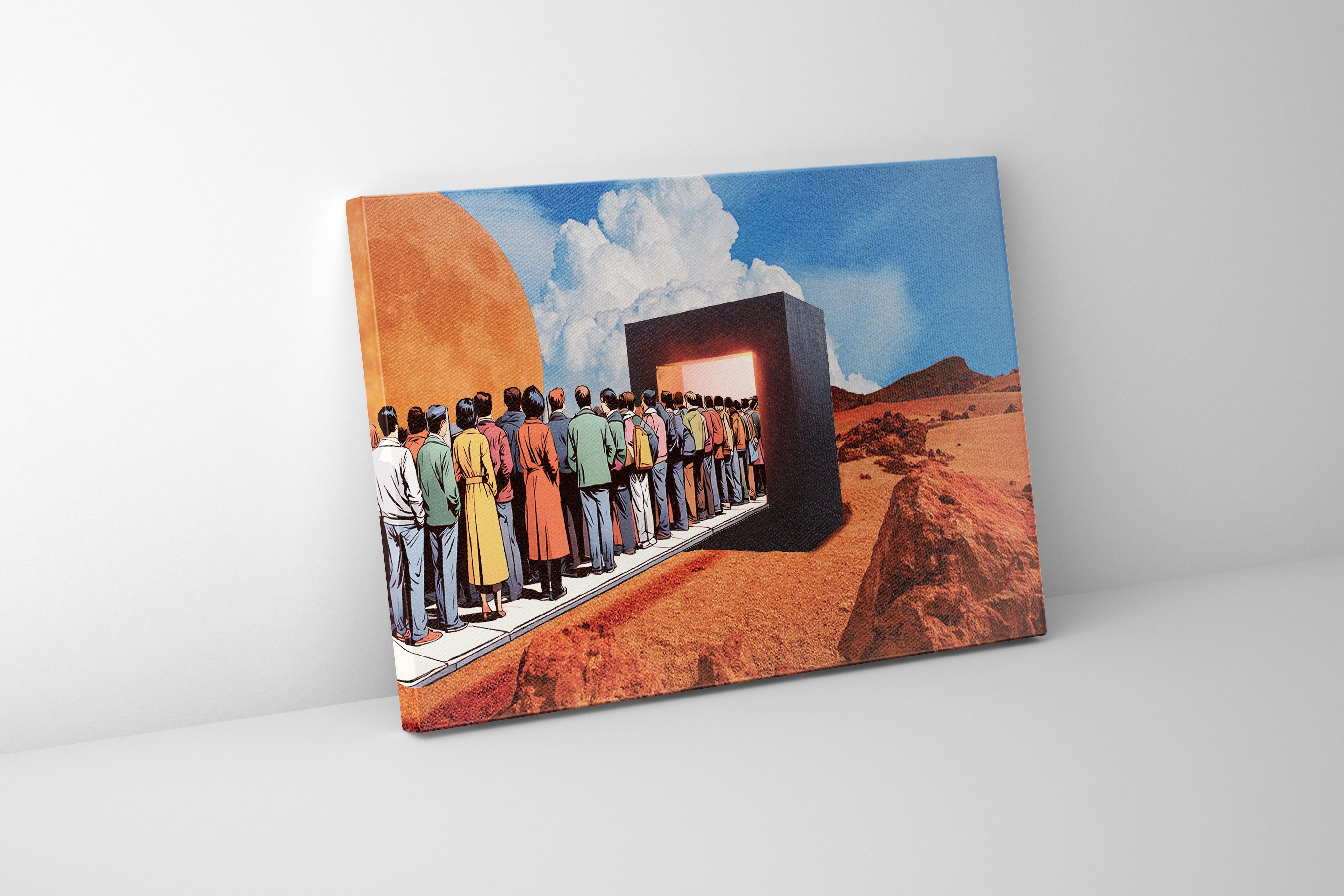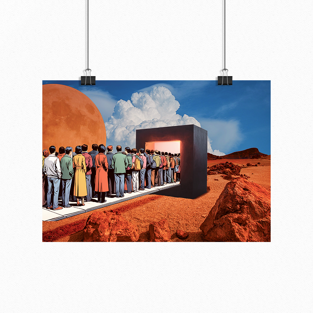 Waiting on Mars flips conformity on its head — a bold surrealist piece for those who forge their own way. Stand out. Move first.